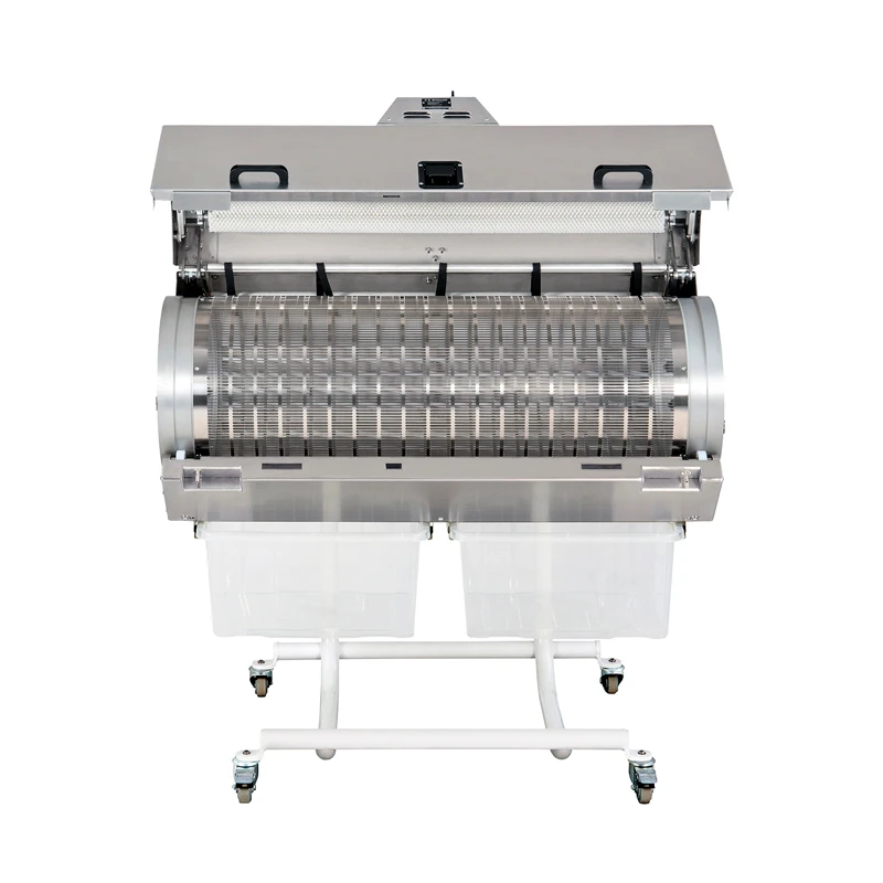 Mit einem Trommeldurchmesser von 48 cm, einem 370-Watt-Motor und 3 Geschwindigkeitsstufen erreicht er eine Produktion von 45 kg/h und ist damit der leistungsfähigste Trockentrimmer auf dem Markt.