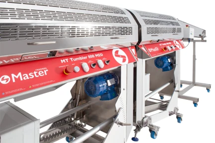 Wir wissen, dass Wartung und Reinigung für eine optimale Produktion und die beste Schnittqualität unerlässlich sind. Deshalb ist der MT Tumbler 800 so konstruiert, dass er leicht zu warten und zu reinigen ist, um den Betrieb und die Schnittqualität zu gewährleisten. Sie ist so konstruiert, dass die Messer leicht und ohne Werkzeug ausgebaut werden können. Nach dem Ausbau und der Trennung von der Maschine können Sie die Messer problemlos reinigen. Wenn sie bereits sauber sind, können Sie sie ganz einfach einstellen, denn wenn sie von der Maschine getrennt sind, können Sie bequem arbeiten und den Schnitt mit den Spannschrauben nach Ihren Wünschen einstellen. Sie möchten Ihren Produktionsrhythmus für die Reinigung/Wartung nicht unterbrechen? Mit dem MT Tumbler 800 können Sie das! Die Trommel und die Bürste sowie die Klingen lassen sich leicht und ohne Werkzeug ausbauen. Mit einem Ersatzteilset können Sie sie in Sekundenschnelle austauschen, ohne die Produktion zu unterbrechen, und die Reinigung bei laufender Maschine durchführen.