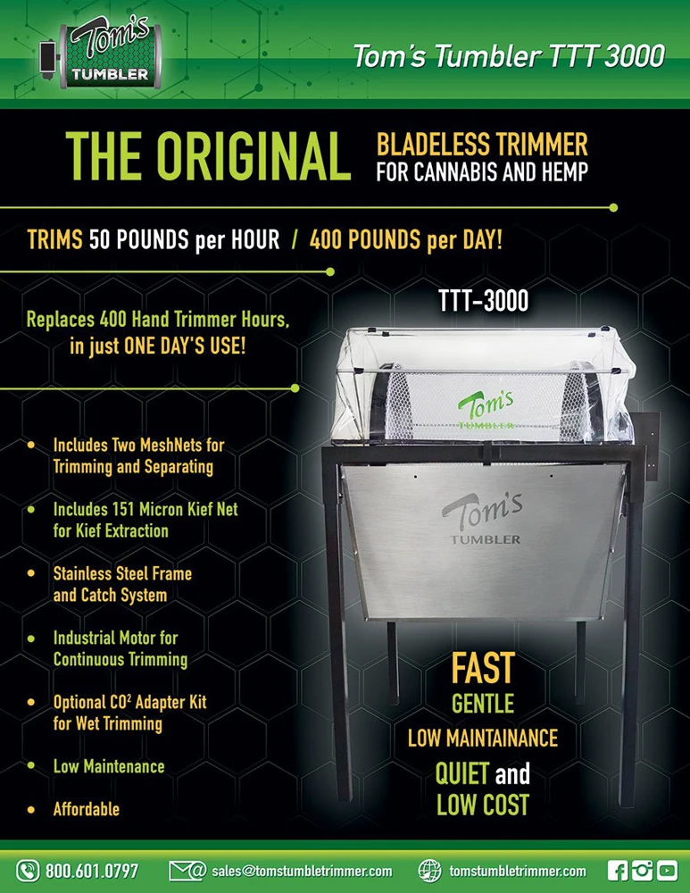 Der neueste und größte Tom's Tumbler Trimmer ist jetzt erhältlich! Der TTT 3000 kann bis zu 22 kg getrocknete Blumen pro Stunde und 180 pro Tag trimmen! Die Trommel trimmt 7 kg pro 3-5 Minuten...