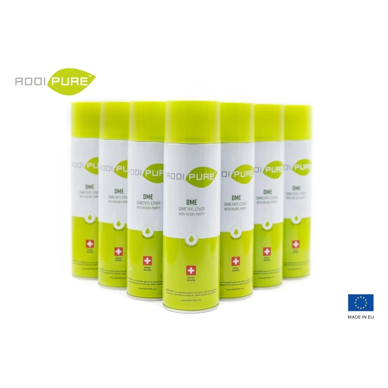El éter dimetílico (DME) de ADDIPURE es un agente extractor orgánico puro producido ecológicamente en la Unión Europea, con una pureza del 99,99%, confirmada y certificada regularmente por laboratorios suizos independientes.