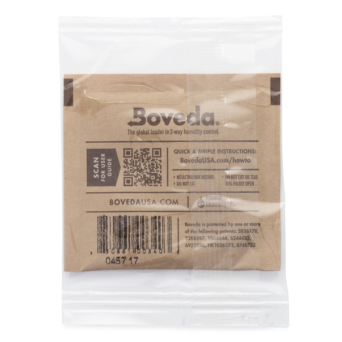 Los paquetes patentados de Boveda dentro del recipiente mantienen estable la humedad relativa y, si es necesario, añaden o absorben humedad para mantener el contenido constante al 62% (+/- 1%).
