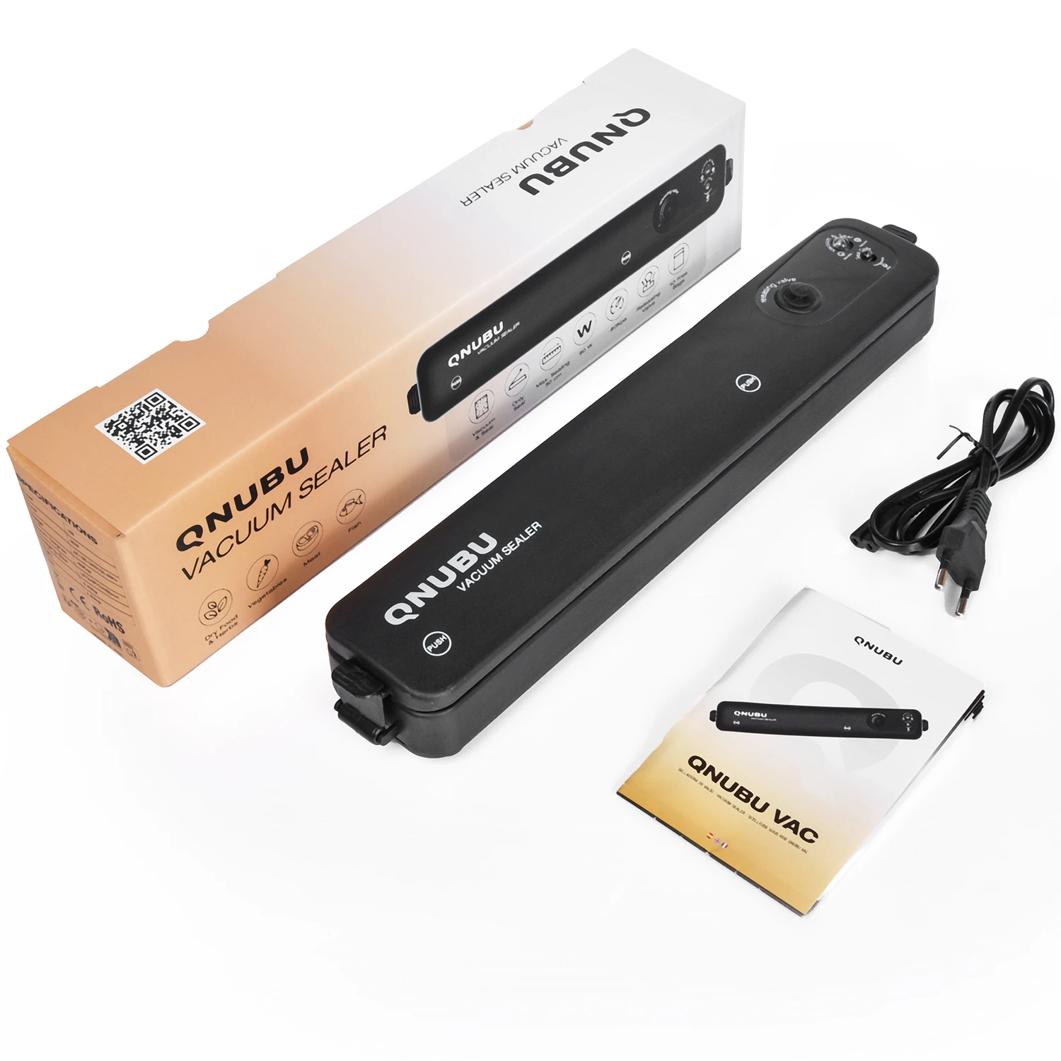 La envasadora al vacío QNUBU VAC está diseñada para envasar al vacío distintos tipos de productos. Incorpora dos funciones: sellado automático al vacío y con calor o sólo sellado. Con sólo pulsar un botón, podrá sellar bolsas de vacío y conservar sus productos durante más tiempo con facilidad. La solución ideal para el envasado doméstico.