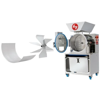 Er ist aus Edelstahl gefertigt und entspricht zu 100 % den GMP-Anforderungen. Der große Trichter mit einem Fassungsvermögen von 50 Litern ermöglicht eine maximale manuelle Beladung, und der Auffangbehälter mit einem Fassungsvermögen von 45 Litern erleichtert die Verwaltung des Produkts, wobei ein Sichtfenster die gesamte Produktion überwacht.