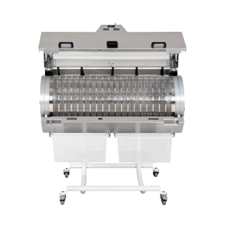 - Apertura frontale per rimuovere il tamburo in meno di 10 secondi, facilitando la pulizia e la manutenzione senza bisogno di attrezzi, la più veloce sul mercato.